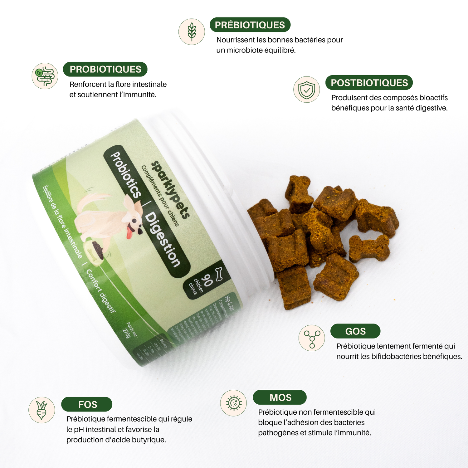 Ce complément alimentaire prébiotique et probiotique est conçu pour apporter confort digestif et équilibre de la flore intestinale à votre chien. Idéal avant, pendant et après un traitement antibiotique ou pendant et après un traitement de vermifugation, il permet une meilleure digestion, soutient l’immunité, réduit gaz et flatulences et favorise la santé générale de votre toutou.
